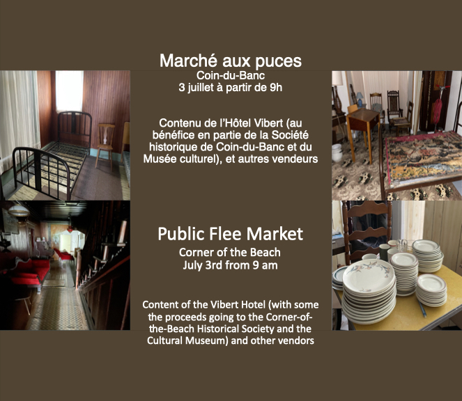 Marché aux puces, ce samedi! // This Saturday, come to our Public Flee Market! June 29, 2021 by The Corner of the Beach Historical Society Leave a comment Share this: Click to share on X (Opens in new window) X Click to share on Facebook (Opens in new window) Facebook Click to email a link to a friend (Opens in new window) Email Like Loading... Related