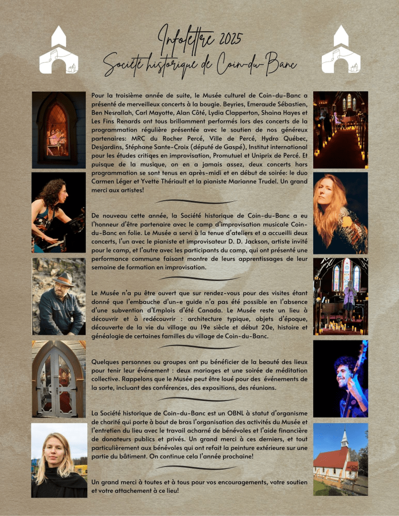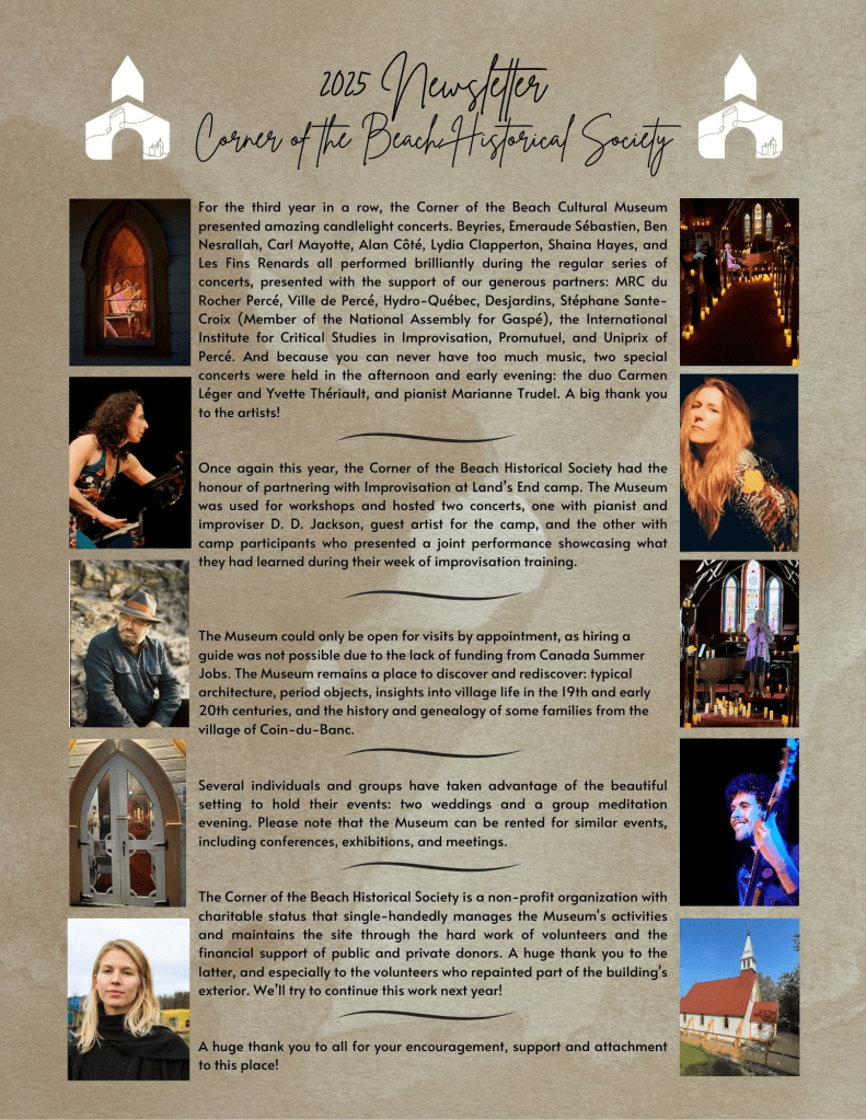 De la très belle musique a encore cet été fait raisonner le Musée (ancienne église St-Luke) avec dix merveilleux concerts à la bougie. Nous vous remercions sincèrement de votre soutien et de votre présence. N’hésitez à nous écrire (shcbhs@outlook.com) pour nous faire part de vos commentaires et suggestions (incluant des idées pour des artistes à inviter à l’été 2026) 😊